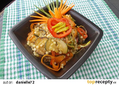 Restovaná cuketa, dva druhy paprik, pórek, cibule a nudličky mrkve na jedné pánvi s maďarskou tarhoňou a přírodním tofu.